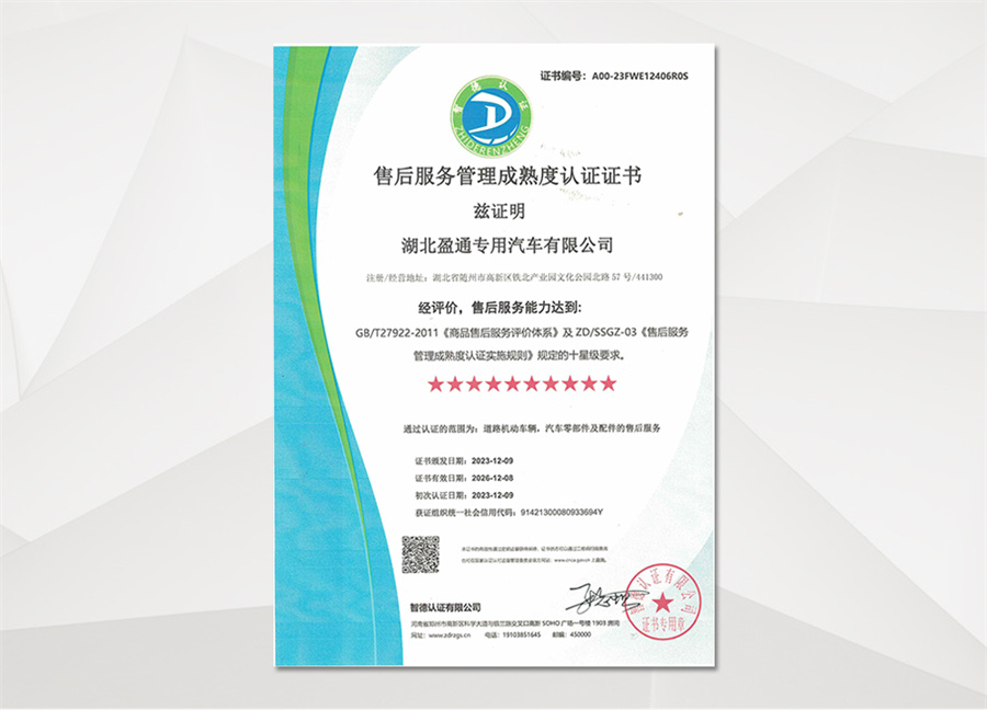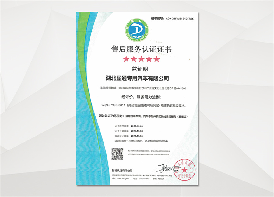 湖北盈通專用汽車有限公司承諾:凡屬本公司生產銷售的產品,底盤部分,全國服務站均可聯保,專用部分三包服務一年,售后服務四十八小時到位處理,終身負責維修并提供終身免費技術服務。