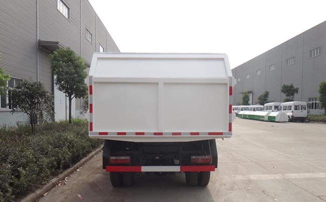 容積7~8立方米,方形密封式箱體,材質邊三底四,國產油泵、多路閥、取力器、液壓油缸,駕駛室外部操作,箱體底部雙杠液壓舉升卸料,箱體后門液壓開啟。