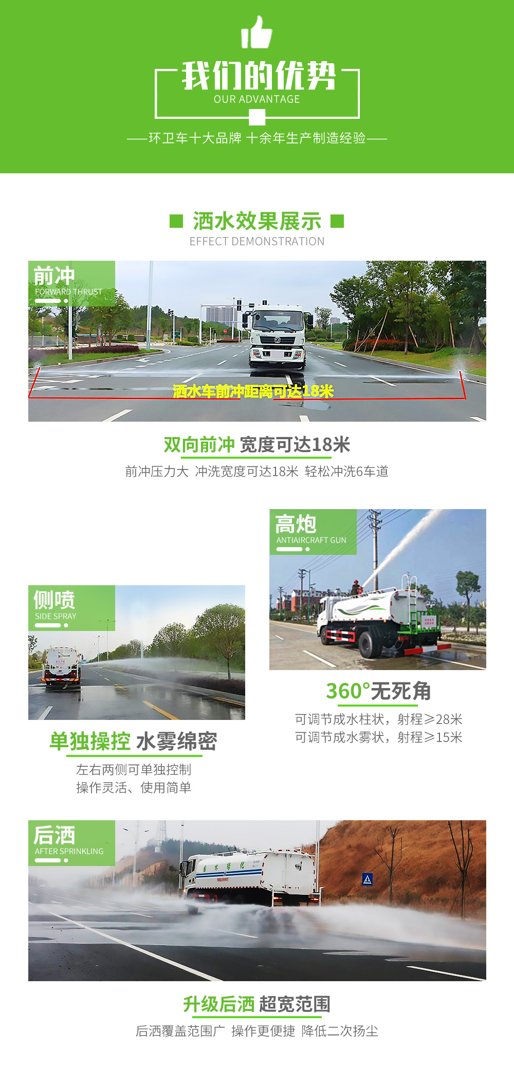 專用功能配置:罐體實際容積16立方米,公告有效參數(shù)15.8立方米、額定載質(zhì)量9805KG/采用武鋼優(yōu)質(zhì)碳鋼板卷壓成型配備專用灑水泵,自吸自排前噴后灑側(cè)噴后工作平臺及灑水高壓炮灑水泵自吸高度為6米左右,整車灑水寬度14米左右,后工作平臺水炮可調(diào)成:直沖狀大雨中雨小雨毛毛雨,有效射程28,整車帶接頭水位計,自流閥后工作平臺主管路帶1寸澆花接口,附送23米水管,1個爬梯,兩側(cè)及后保險杠。