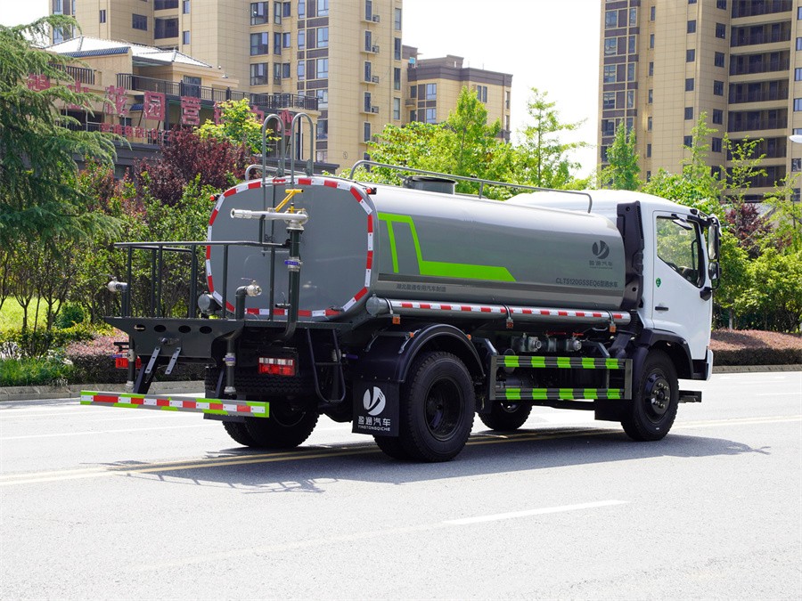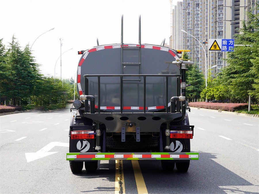 罐體容積9立方,罐體為橢圓或方形,罐體用4MM碳鋼板制作,罐內隔板具有防波作用,以減低汽車行駛時罐體液體的沖擊。整車帶一個專用灑水泵(垂直最大吸程6米),灑水寬度14米,射程28米。多功能灑水車配備2個前沖(噴)(能將路面泥巴、塵土、垃圾沖干凈);2個后灑(能均勻地將水灑在路面,一次灑水寬度14米)、2個側噴(花灑)(能均勻地將路旁綠化帶澆灌)、帶1個后工作平臺,平臺上安裝1個綠化灑水高炮(灑水炮可全方位旋轉,可連續調成直沖狀、大雨、小雨、毛毛雨,霧狀可調節沖洗高大樹木),引水時間<5min,流量90m3/h。帶1個消防接頭,帶1個自流閥,1個過濾裝置、人性化爬梯及側防護欄,安裝灑水音樂喇叭。補充說明:可加裝空調、氣動控制閥、噴藥設備等專業配置。