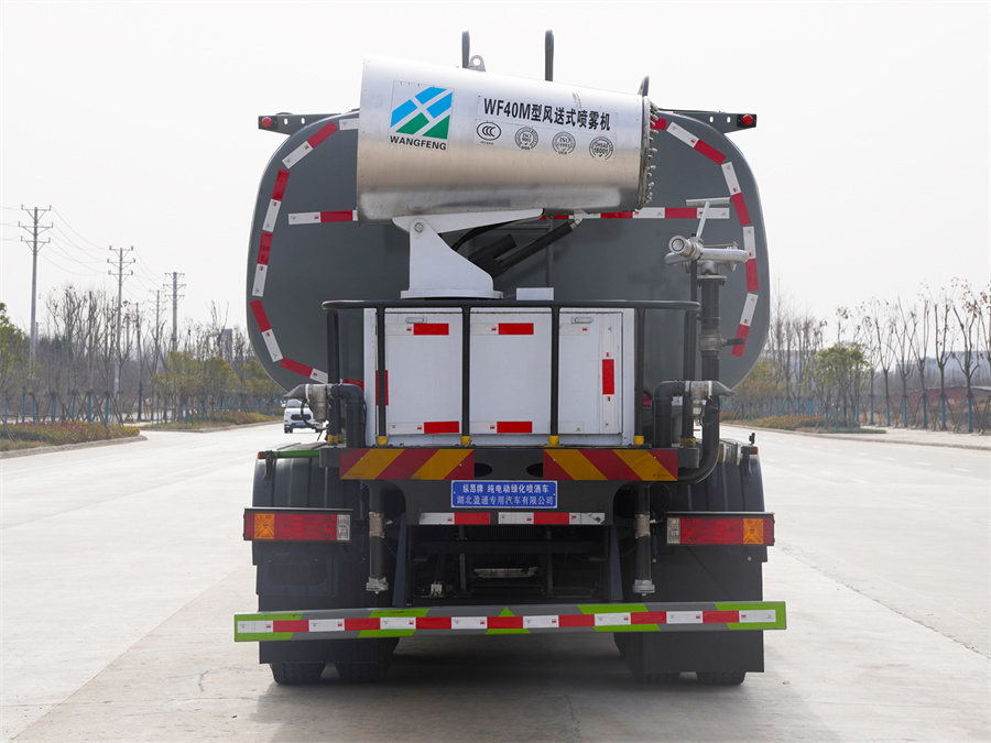 陜汽德龍18噸電動灑水車該車主要用于城鄉園林綠化,路面噴灑;主要裝置為罐體及噴灑裝置;罐體總容量:16.43立方米;罐體有效容積15.6立方米;介質:丙酮水溶液,密度950千克/立方米,罐體外形尺寸(長×長軸×短軸)(mm):6500×2450×1500;側防護材料為鋁合金+Q235碳鋼,連接方式為螺栓連接;后防護材料為:Q235碳鋼,連接方式為:螺栓連接;后部防護截面尺寸(mm):120×50,后部防護離地高度(mm):490;ABS系統生產廠家及型號分別為:廣州瑞立科密汽車電子股份有限公司(型號:CM4XL-4S/4M),西安正昌電子有限責任公司(ZQFB-V),浙江萬安科技股份有限公司(VIE ABS-Ⅱ);EBS系統生產廠家及型號分別為:廣州瑞立科密汽車電子股份有限公司(型號:CM-EBS);儲能裝置種類/型號/單體生產企業/總成生產企業:磷酸鐵鋰蓄電池/CB240/寧德時代新能源科技股份有限公司/寧德時代新能源科技股份有限公司、磷酸鐵鋰蓄電池/LF304/湖北億緯動力有限公司/湖北億緯動力有限公司、磷酸鐵鋰蓄電池/CB310/寧德時代新能源科技股份有限公司/寧德時代新能源科技股份有限公司、磷酸鐵鋰蓄電池/CB230/寧德時代新能源科技股份有限公司/寧德時代新能源科技股份有限公司、磷酸鐵鋰蓄電池/0JFCBB4A/武漢弗迪電池有限公司/濰柴新能源動力科技有限公司、磷酸鐵鋰蓄電池/CB67/瑞浦蘭鈞能源股份有限公司/中聯重科股份有限公司;TZ420XS001型驅動電機峰值功率360kW、額定功率250kW,TZ400XS023驅動電機峰值功率360kW、額定功率240kW;TZ375XSSF-SZF604型驅動電機峰值功率410kW、額定功率262kW;TZ400XS033型驅動電機峰值功率410kW、額定功率270kW;儲能裝置單體/儲能裝置總成/驅動電機/驅動電機控制器配置關系為:CB240/L302H01、L302C01/TZ420XS001/KTZ60X69S001,CB240/L302H01、L302C01/TZ400XS023/KTZ65X69S027,CB240/L302H01、L302C01/TZ375XSSF-SZF604/KTZ60X69SSFD01,LF304/H304L-1P72SHW、C304L-1P36SHW/TZ375XSSF-SZF604/KTZ60X69SSFD01,CB240/L302H01、L302C01/TZ400XS033/KTZ60X70S037,CB310/L280C01/TZ400XS033/KTZ60X70S037,CB230/L228H01/TZ400XS033/KTZ60X70S037,LF304/H304L-1P72SHW、C304L-1P36SHW/TZ400XS033/KTZ60X70S037、0JFCBB4A/WEB115V332-02、WEB96V332-02/TZ400XS033/KTZ60X70S037、CB67/L306C2/TZ400XS033/KTZ60X70S037;選裝大工作平臺,選裝前部電子水炮樣式;選裝前部不帶電子水炮,該狀態下車長為11260mm,10800mm;當前部安裝電子水炮時,車長為11760mm,11300mm,車輛前伸500mm;僅采用底盤1800+3400+1400mm軸距改裝;隨底盤選裝限速裝置,限速60km/h;僅采用11.00R20 18PR輪胎。