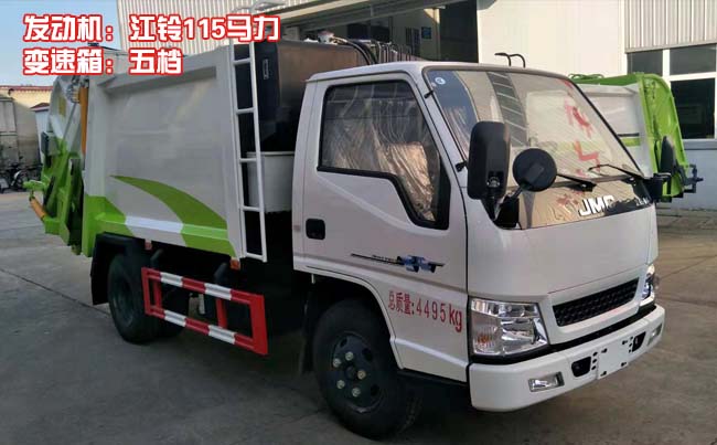 江鈴順達(dá)藍(lán)牌壓縮式垃圾車,江鈴順達(dá)原裝底盤,2800軸距,國(guó)五江鈴115馬力柴油電噴發(fā)動(dòng)機(jī)(型號(hào):JX493ZLQ5),五檔變速箱,方向助力,油剎,7.00R16鋼絲胎,ABS,空調(diào)。